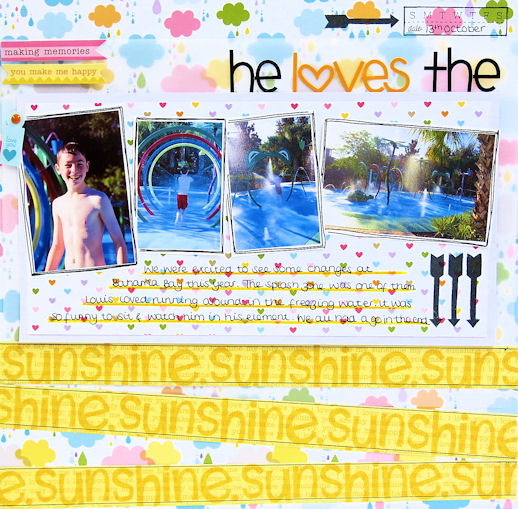 I just love clouds. I have a bit of a thing for them when it comes to scrapping. I'm working my way through scrapping our 2014 Florida photos and I'm thankful to say, we have no rainy photos. I still wanted to use this paper though. It's so pretty!!
