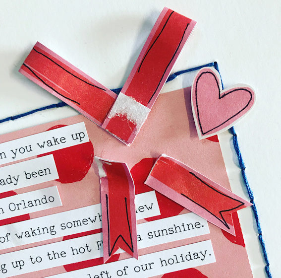 The blue strip with flowers first, then a wider strip with the red and pink flowers, but I only stuck the very top of the paper in place. Then over the join of these two papers I stuck the red hearts strip down.