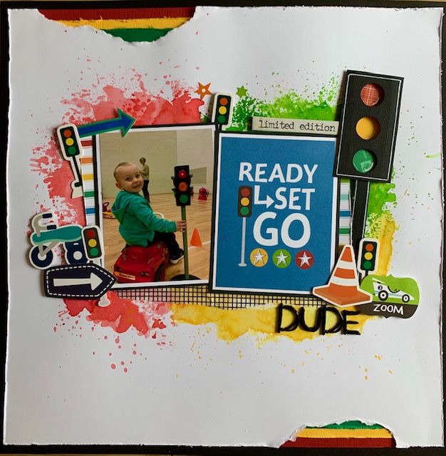 I felt like the layout needed more pops of black to balance it out because the traffic light was so dark, so I added a strip of torn washi tape underneath the photos. I had a few cardboard traffic lights in my stash that I rescued from a really cheap toy my son had that broke and was recycled, so I scattered these around my photo and title card, raising the top half up on each one to add dimension.
