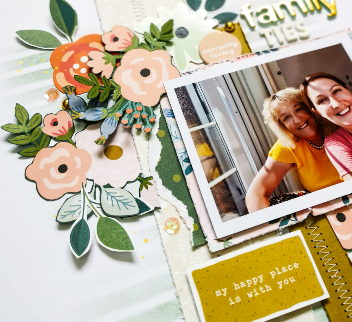 I layered the florals so that some were flat and others were raised on foam pads, arranging them diagonally across the page with space for my photograph in the middle. For those that were glued flat, I left the ends glue free so I could curl the paper slightly to add a bit of extra dimension.