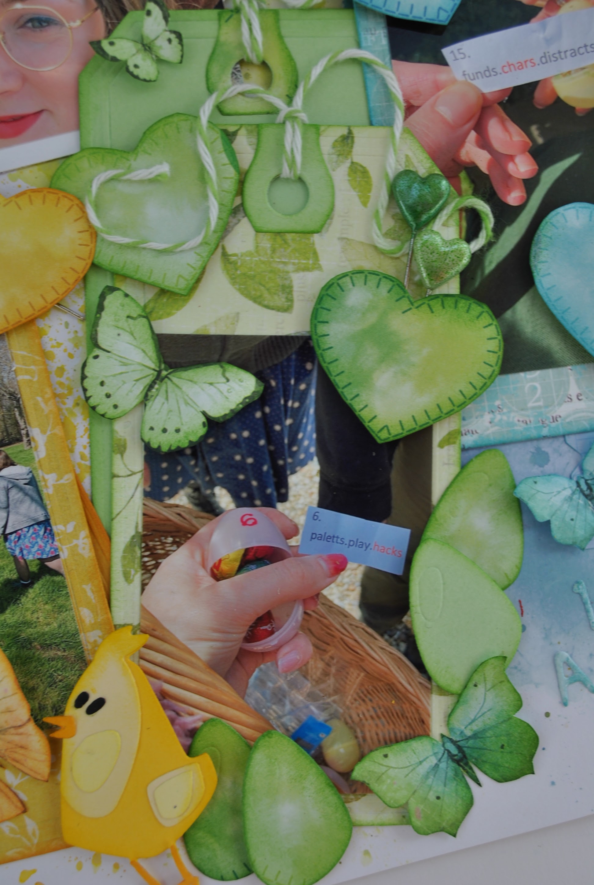I found some decorative pins in my stash and added two to each area, together with some of the chipboard and die cut embellishments from the kit.