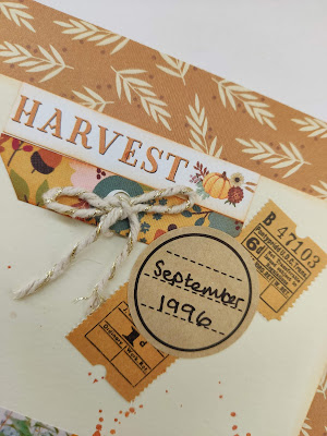 The photos were added, tucking them under the burlap strip. I cut the two tag tops from the manufacturer's strip, and punched holes, then tied more of the twine through each hole and tied them in a bow. I placed one of these above the left-hand photo and the other up-side-down from the top right. I added tickets and labels from the kit to these tag tops to create small clusters.
